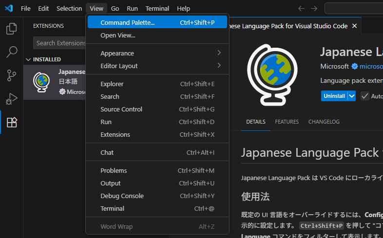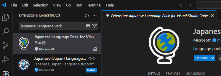 3.「Japanese Language Pack for Visual Studio Code」 をインストールします。